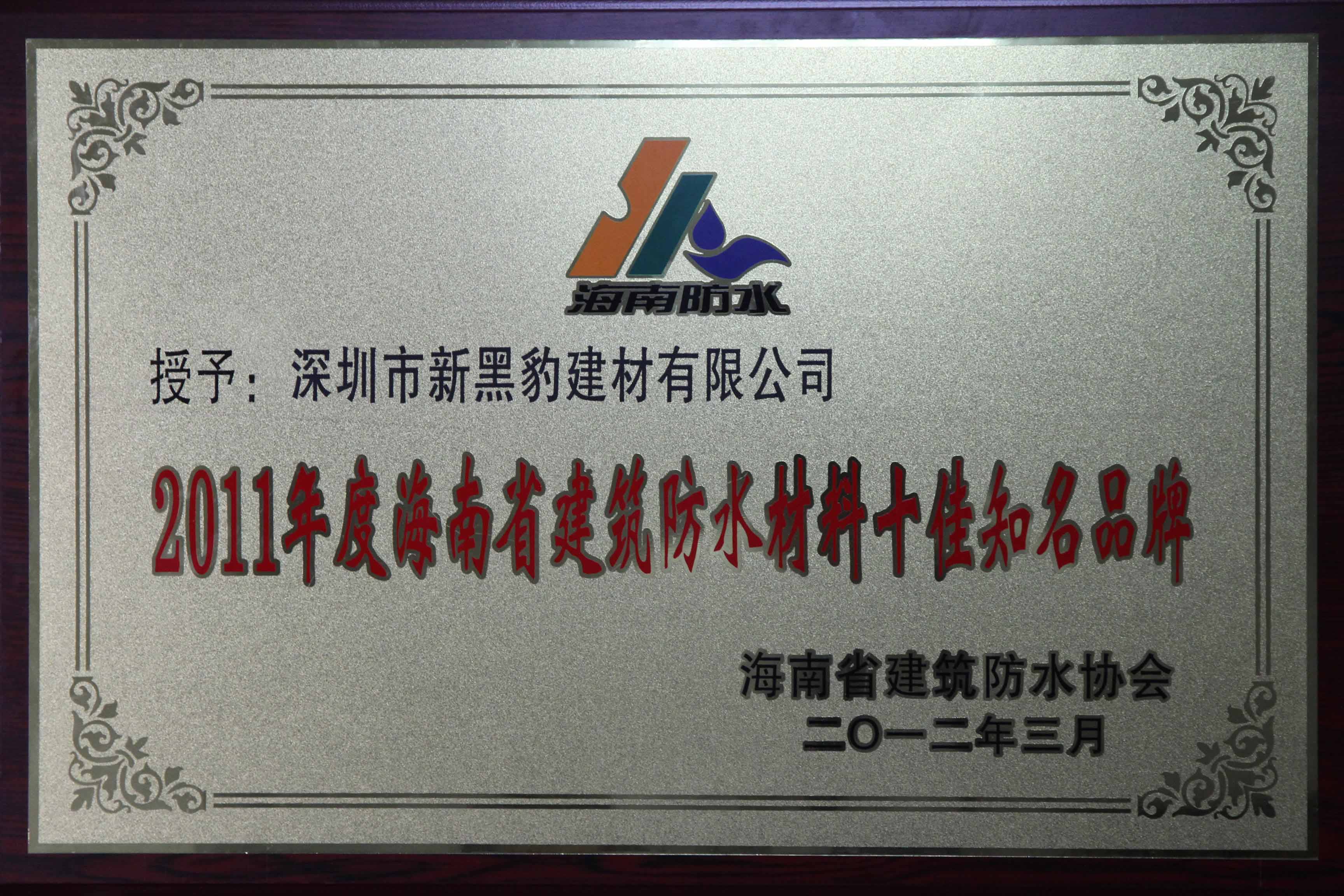 深圳市新黑豹建材有限公司獲得“2011年度海南省建筑防水材料十佳知名品牌”