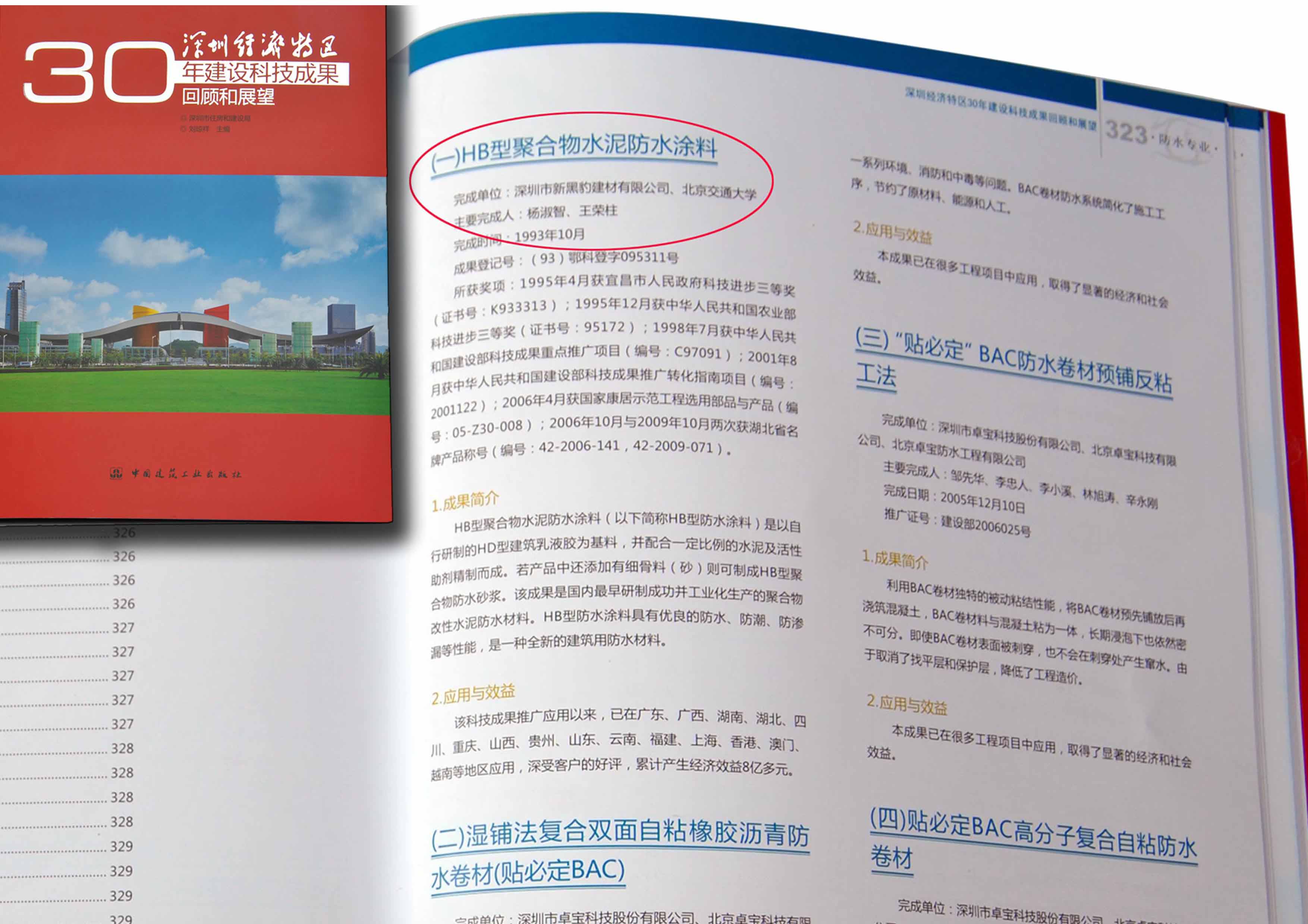 2010年8月1日出版的《深圳經(jīng)濟(jì)特區(qū)30年建設(shè)科技成果回顧和展望》匯集了深圳30年來(lái)取得的1000多項(xiàng)重點(diǎn)建設(shè)科技成果,圖文并茂,內(nèi)容豐富,堪稱(chēng)30年深圳建設(shè)科技的集大成者,具有較高的學(xué)術(shù)價(jià)值,有助于海內(nèi)外讀者更好地了解深圳建設(shè)科技的發(fā)展,對(duì)建設(shè)科技工作者以及從事相關(guān)專(zhuān)業(yè)科研、教學(xué)人員具有較好的參考價(jià)值。在本書(shū)第十二章防水專(zhuān)業(yè)中,深圳市新黑豹公司建材有限公司產(chǎn)品“HB型聚合物水泥防水涂料”收編在內(nèi)。 |