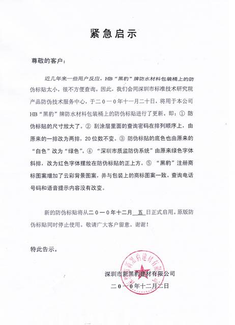 黑豹”牌防水材料包裝桶上的防偽標貼進行了更新